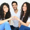 Drei fröhliche Personen heben die Hände, umgeben von Herzen und Konfetti.