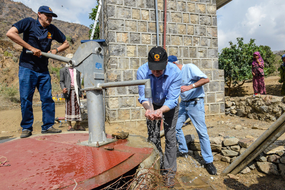 Karl-Otto Zentel und Mitarbeiter an einer Wasserquelle. (CARE/Eman Al Awami,Ammar Bamatraf)