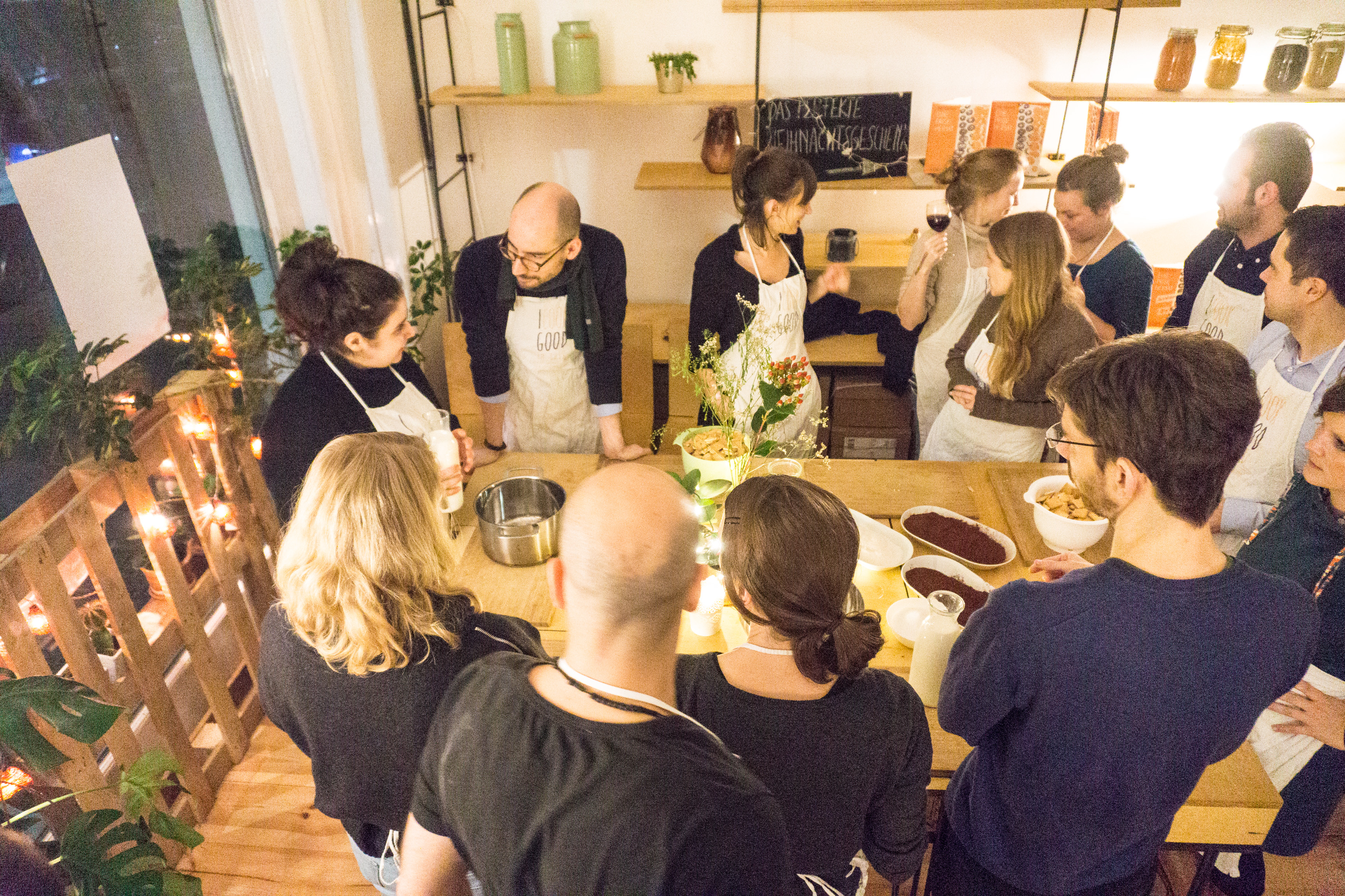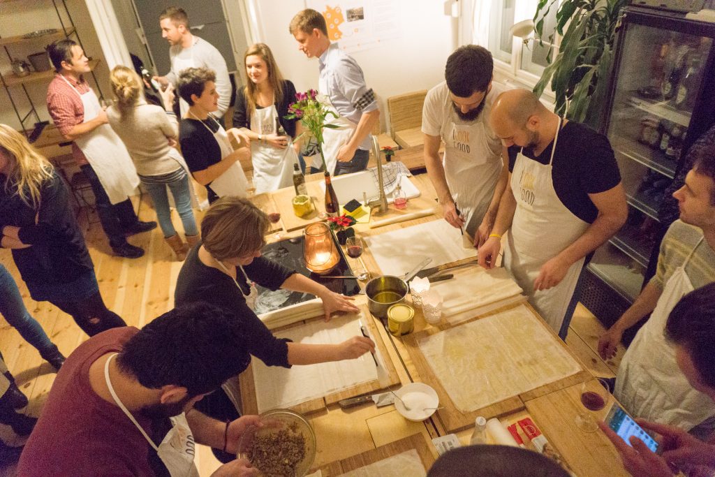 Wir hatten die Möglichkeit das Angenehme mit dem Nützlichen zu verbinden. Mit fast 40 Kollegen haben wir unsere Feier bei “Über den Tellerrand” verbracht. Dieser Berliner Verein bringt Geflüchtete und Beheimatete zusammen, um sich über das gemeinsame Kochen kennenzulernen und so die “Entstehung einer offenen und toleranten Gesellschaft aktiv zu fördern”. Zusammen mit 4 Geflüchteten aus Syrien haben wir die Nachspeisen zu unserem leckeren Essen zubereitet und es hat sogar geschmeckt!
