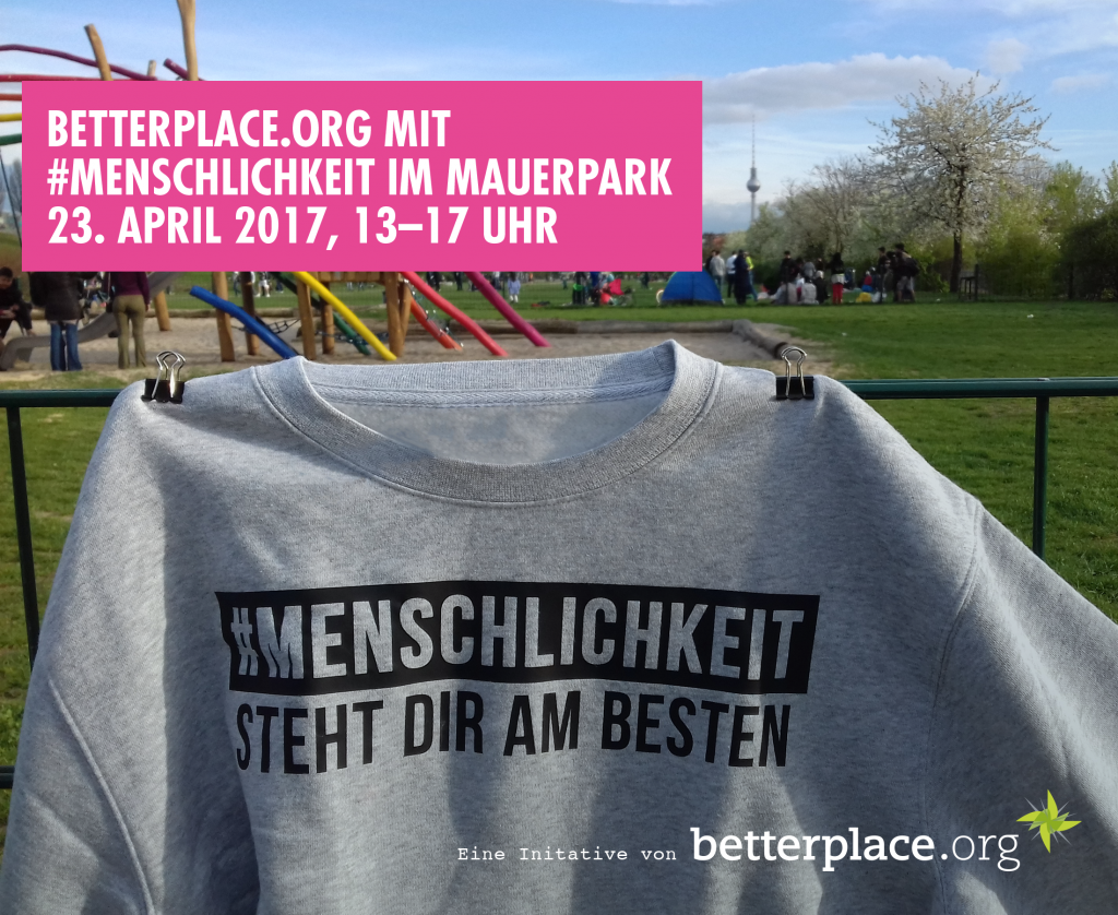 Zum Start der Fashion Revolution Week ist betterplace.org am Sonntag, 23. April ab 13 Uhr mit einer Guerilla-Aktion zur Kampagne #Menschlichkeit steht Dir am besten im Mauerpark in Berlin. Kommt vorbei und wir pimpen Eure Klamotten mit Schablonen und Textilfarbe mit “#Menschlichkeit steht Dir am besten”. So bekommt Ihr ein neues Lieblingsshirt, mit dem Ihr ein Zeichen für mehr #Menschlichkeit setzen könnt, ganz ohne dass neue Textilien produziert werden. Und Ihr schont Euren Geldbeutel. Zusätzlich gibt es einen Inspirations-Wunderbaum für mehr #Menschlichkeit, Seifenblasen und eine Verlosung mit neuen Bio-T-Shirts. Helft mit, die Nachricht zu verbreiten!