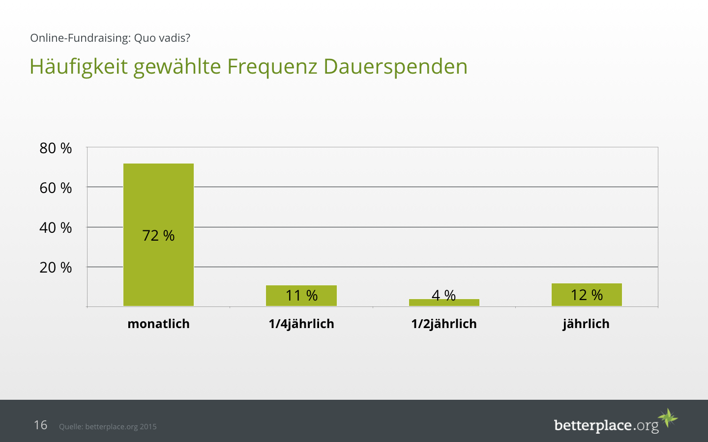 Auch Dauerspender lassen sich online gewinnen. Im Durchschnitt werden 19% der Online Spender zu Dauerspendern. Am häufigsten wählen sie eine monatliche Dauerspende aus: